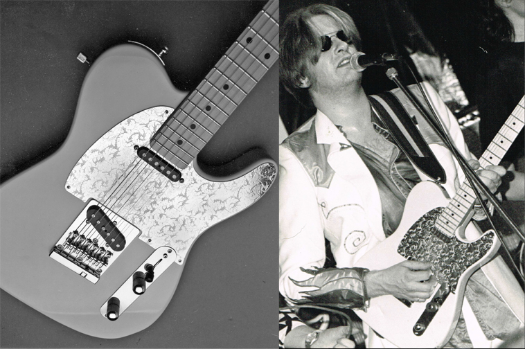 Wir waren zu der Zeit in Europa die einzigen, die eine Tele mit dem String-Bender (Parsons & White) anboten. Bei diesem System wird über den oberen Endpin ein im Korpus befindlicher Mechanismus bewegt, der die H-Saite absenkt. Hier sehen wir Heinz Rebellius mit unserer Kreation.