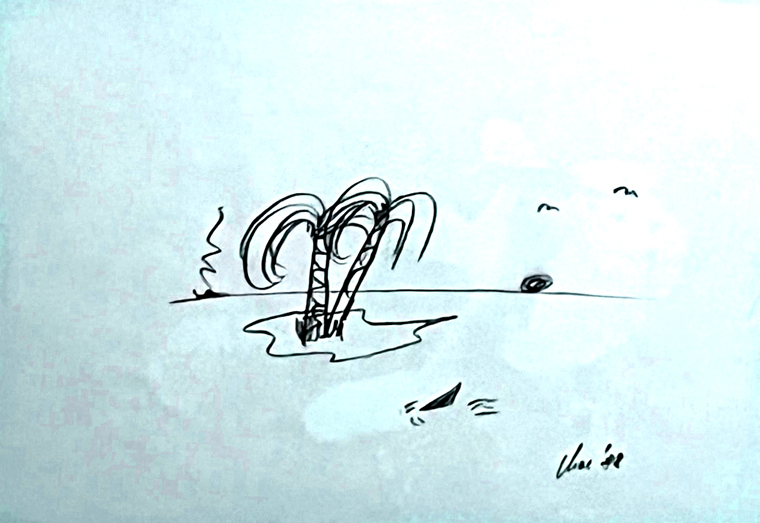 Dieser Mac war ein wunderbarer Schreiber für’s damalige Fachblatt und unser Fan der ersten Stunde. (Außerdem hatte er sich während unseres ersten Musik-Messe-Auftritts ein wenig in unsere Buchhalterin Gerda Maus verguckt. Na ja, da war ihr Nachname schon Programm …) Davon abgesehen stand er auf unsere Produkte, beschwor nahezu unsere positive Energie und liebte unsere bisweilen abstrusen Anzeigen. Und er war Gitarrist, hatte ein Studio in der Nähe von Leverkusen und war Fan von Frank Sinatra. Aber leider auch Fan von harten Drinks, was ihn letztlich in den 90er Jahren unter die Erde gebracht hat. Ein echter Verlust (und nicht nur, weil er immer nette Sachen über uns geschrieben hat). Und wie lieblich hatte er Formentera skizziert:
